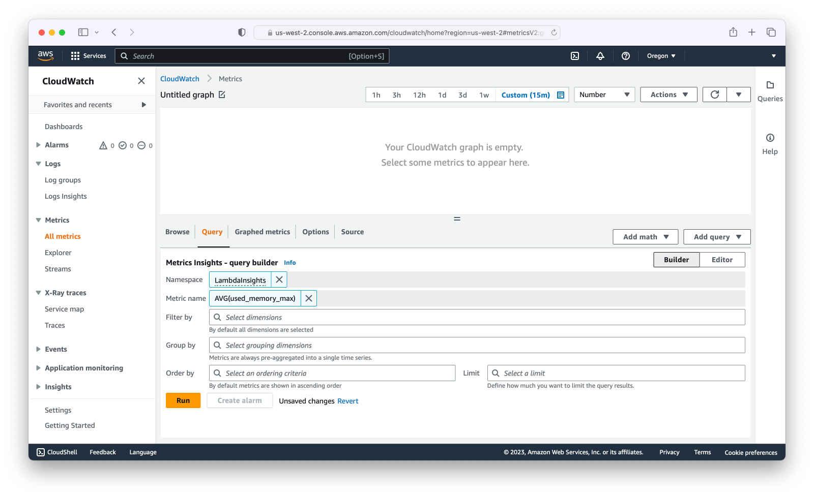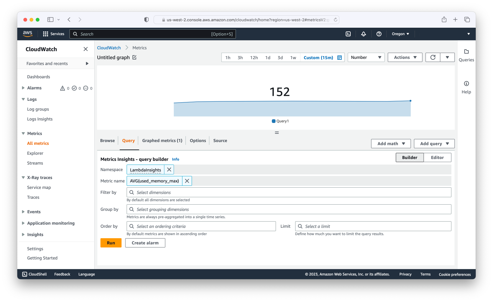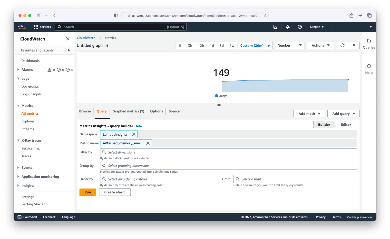 First, define a query on the “All metrics” page to capture the average of the maximum memory used per request. To do this, select the “LambdaInsights” namespace, and the AVG(used_memory_max) metric name, as shown below. Assuming this is the only traffic in your account, you won’t need to filter for a specific Lambda: