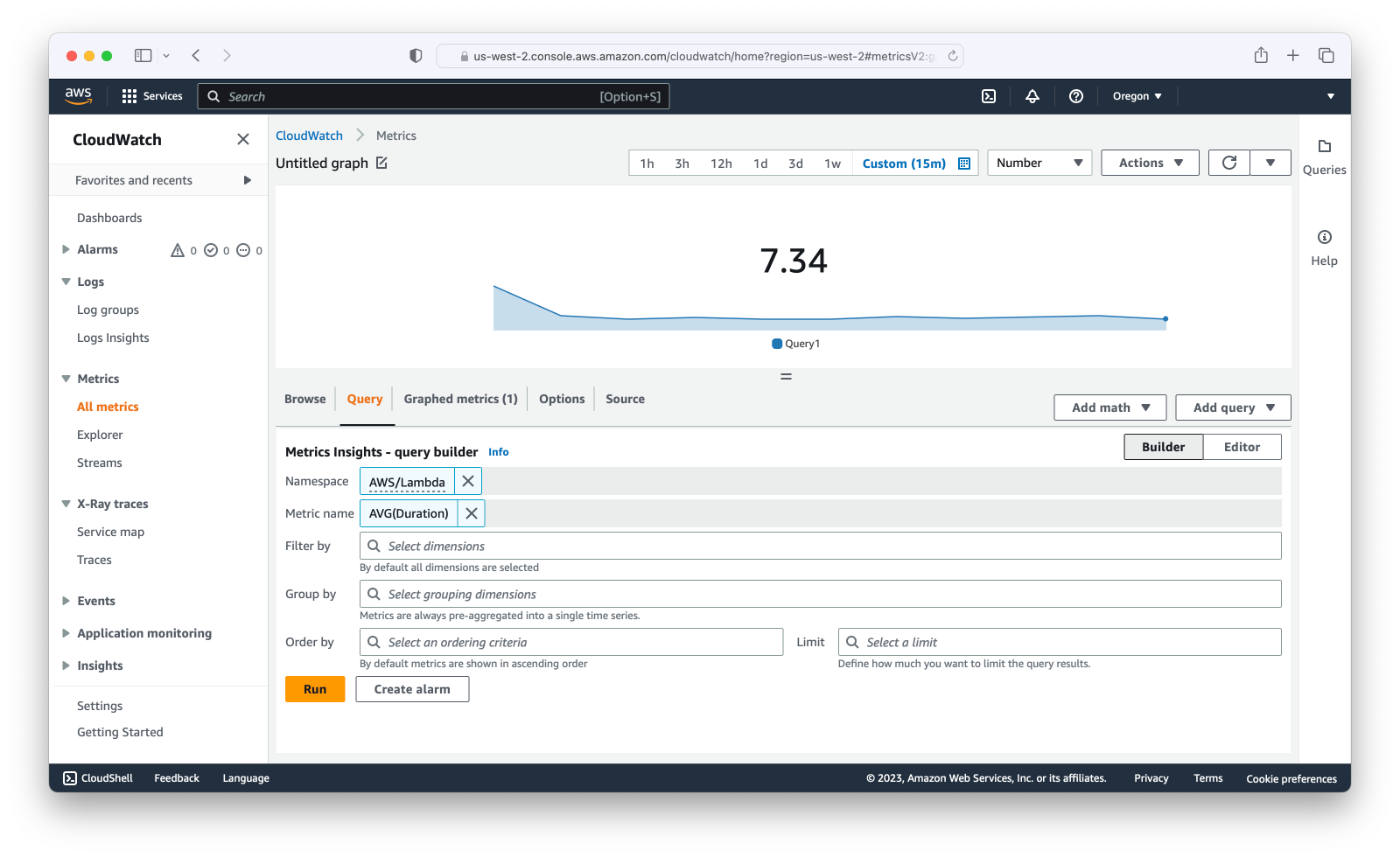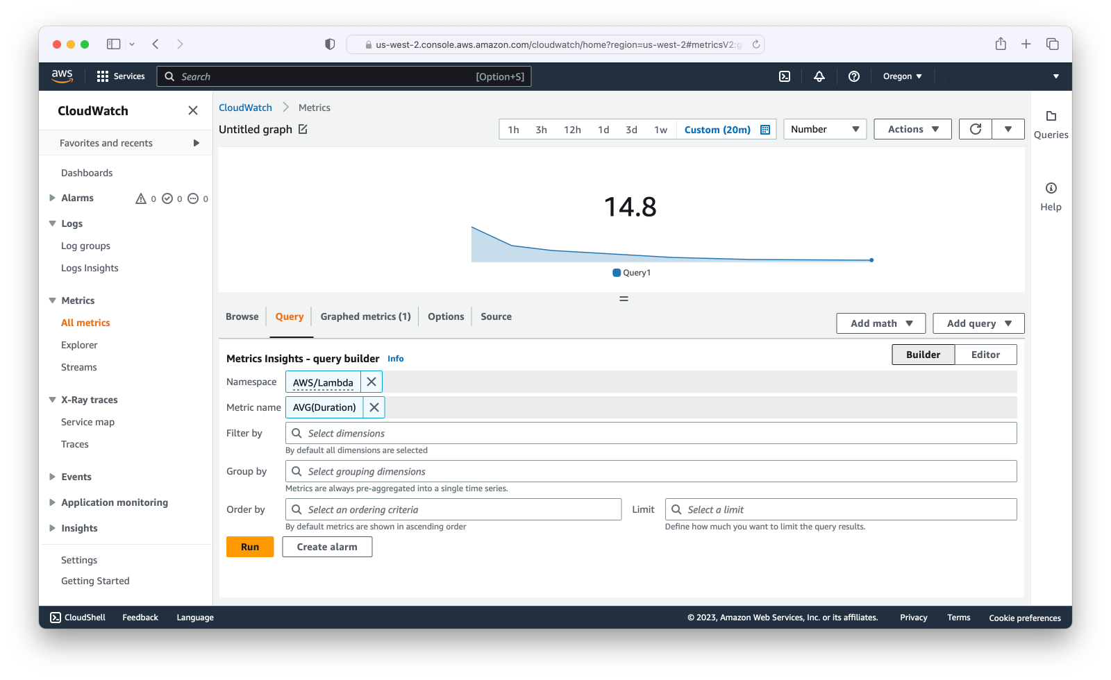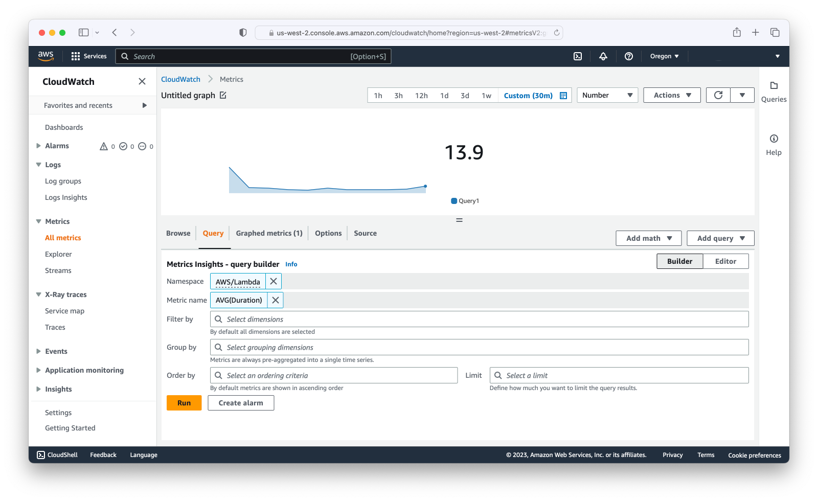Lastly, run a similar query, but for the AWS/Lambda namespace and the Duration metric. Your result for this query should look something like this, indicating an average processing time of 13.9 milliseconds: