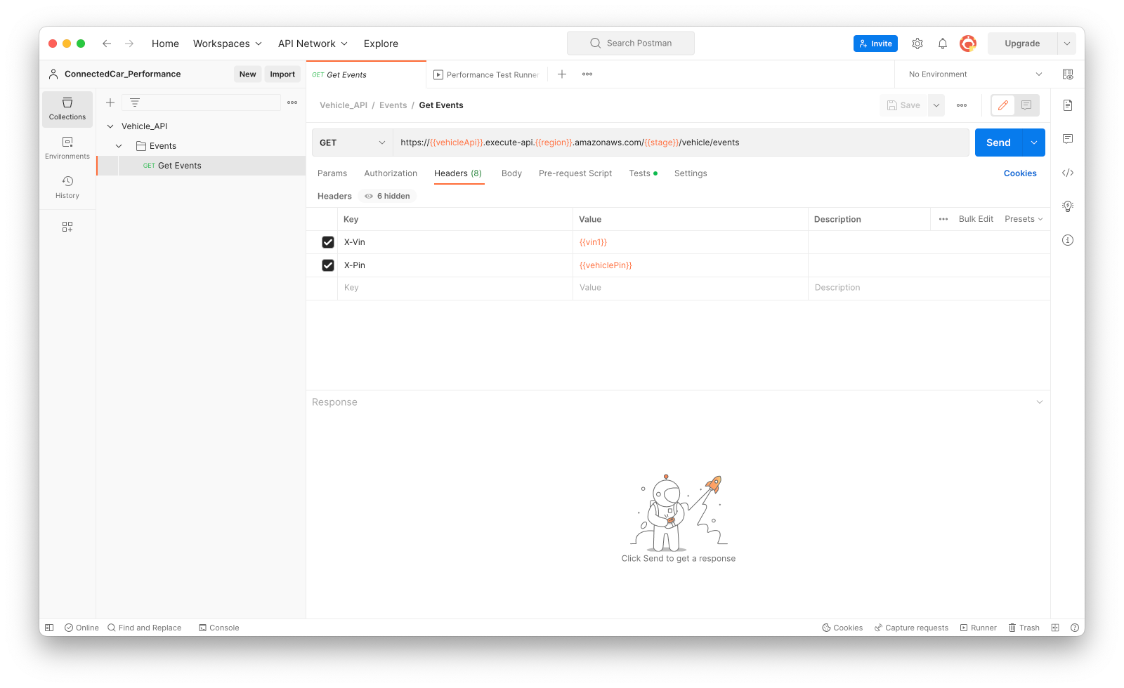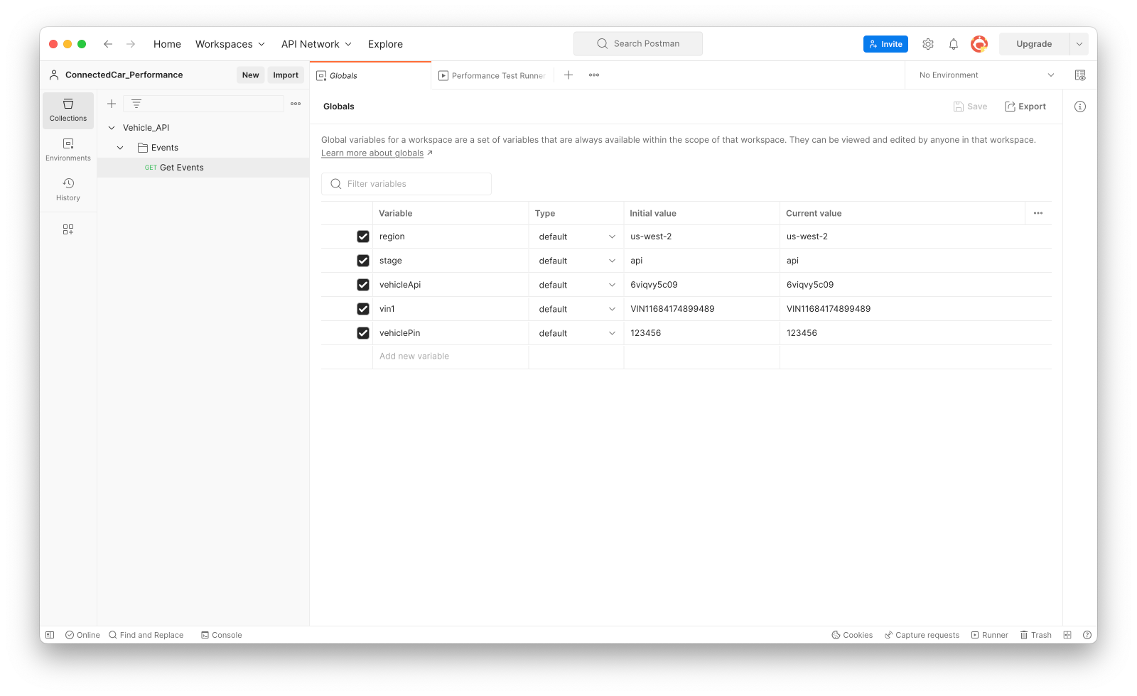 Next, open the Postman Canary application and create a new “ConnectedCar_Performance” workspace. Then, in this workspace, import the “vehicle.postman_collection.json” and “postman_globals.json” files from the “/postman/performance” folder of the aws-connectedcar-common repository. The first import should create a subset of the “Vehicle_API” collection that contains only the one test, as shown below: