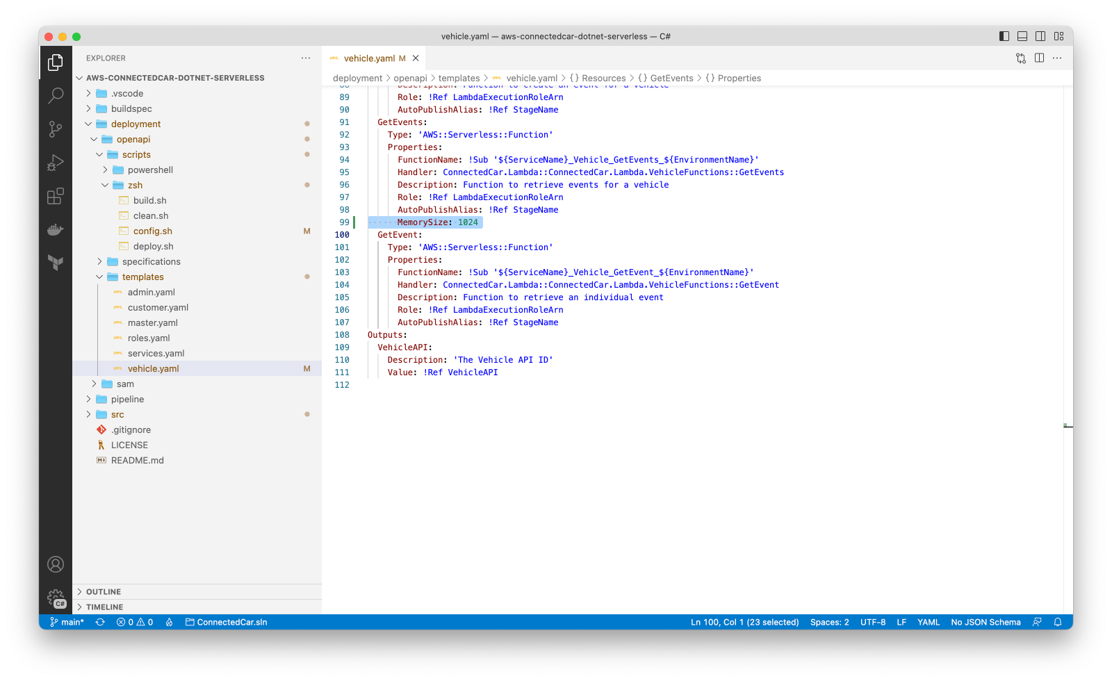 Open the vehicle.yaml template in VS Code, and on the same line that we added in the previous lab, set the MemorySize property to a value of 1024, as shown below:
