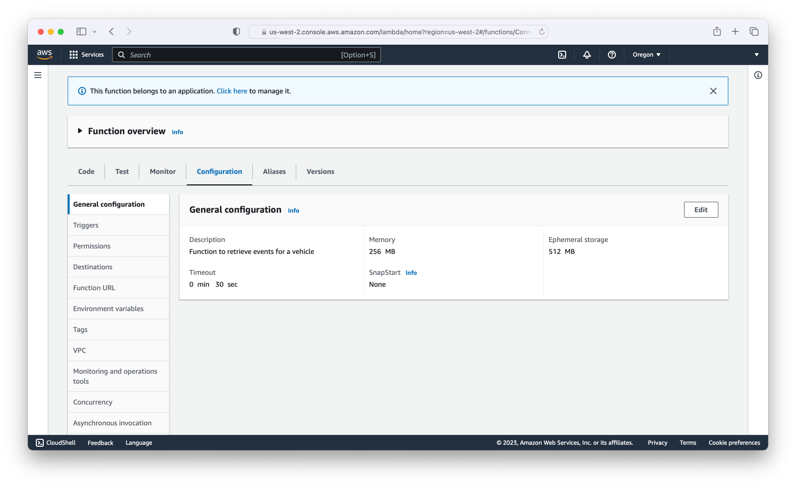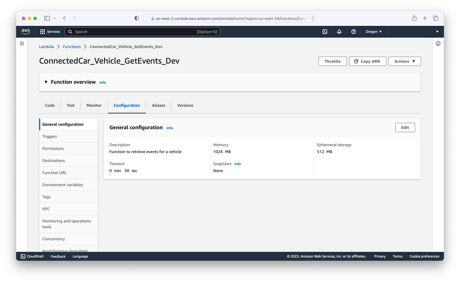 Run the deploy.zsh script in the terminal, and once the outputs appear, go to the console to confirm the configuration update. The Memory property should look like this, under the “General configuration” option for the “ConnectedCar_Vehicle_GetEvents_Dev” Lambda: