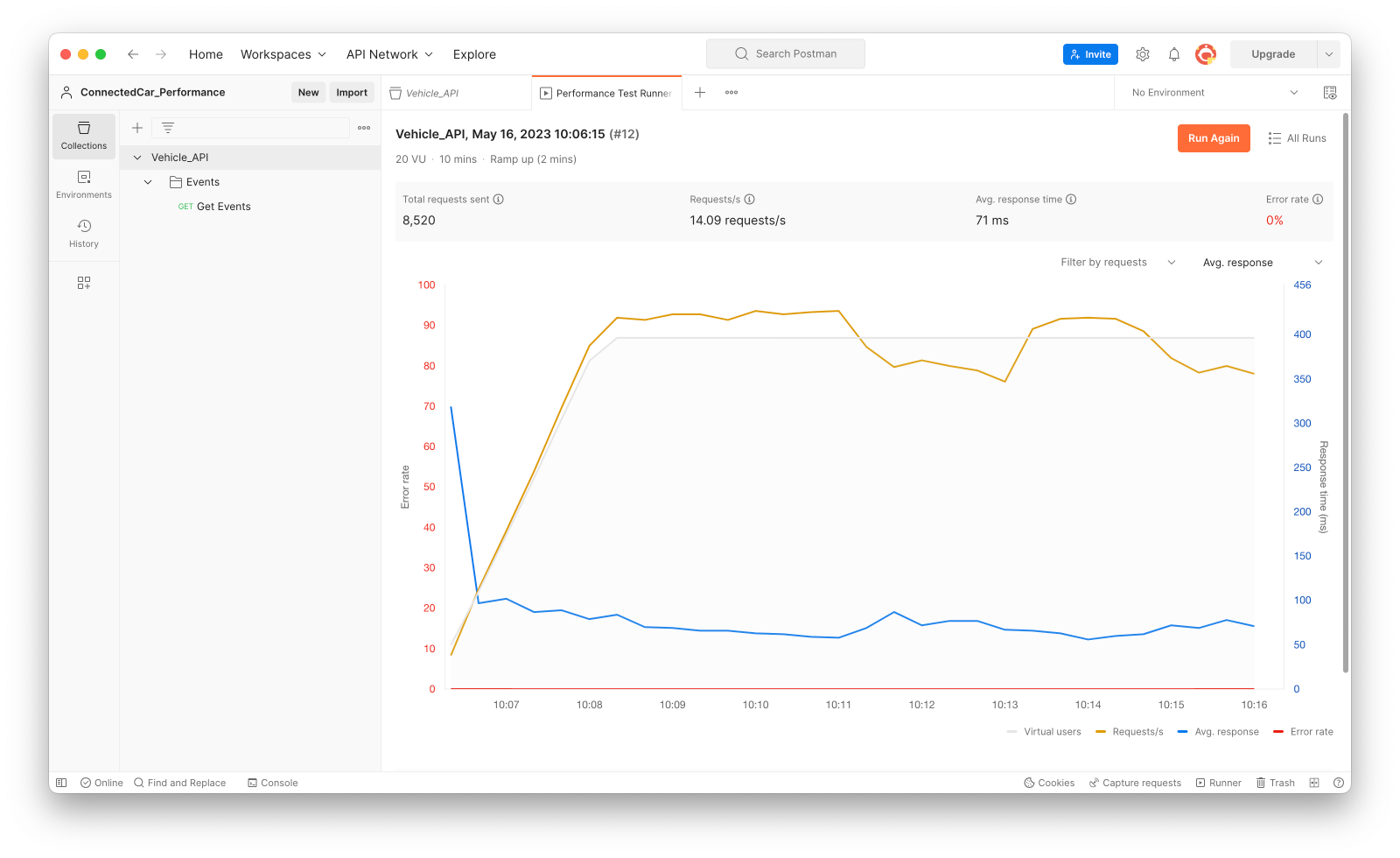And again, run the load test in Postman Canary. After ten minutes you should have another set of graphed results, like this: