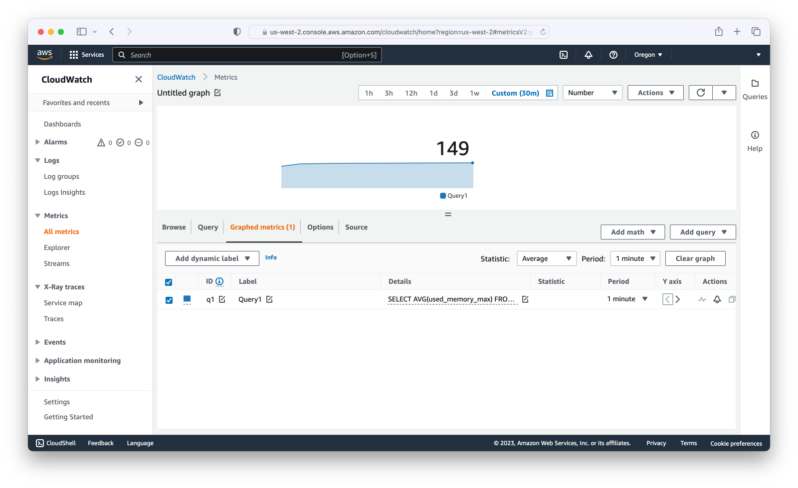 There are still two more things to set. Select the “Number” option for the type of graph, at the top right. Then, to the left of that drop down, filter the time to only cover when the load test was running. Now click the orange “Run” button to execute the query. Once the results are displayed, switch to the “Graphed metrics” tab and set the “Period” to one minute. You should now see a result that looks something like this, indicating a maximum memory used of 149MB averaged across all the Lambda invocations: