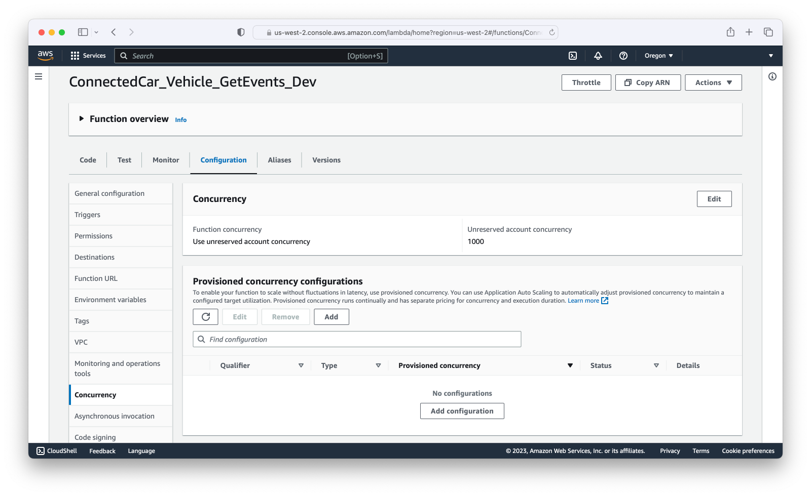 Our first test will use the default reserved concurrency setting that applies when we don’t otherwise specify a value in the templates. As you can see from the console below, in this case the default is the account-level concurrency limit of 1000. Note that for all the tests in this lab, we’re continuing with the performance-optimized memory size of 2048 MB for the GetEvents Lambda.