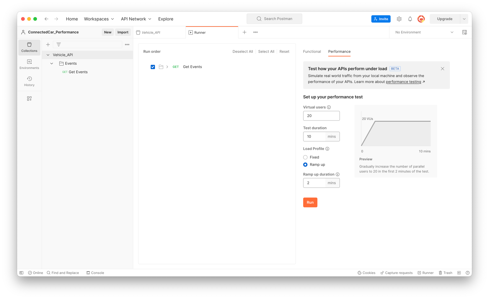 Now, run the load test in Postman Canary using the same settings as in the previous lab: