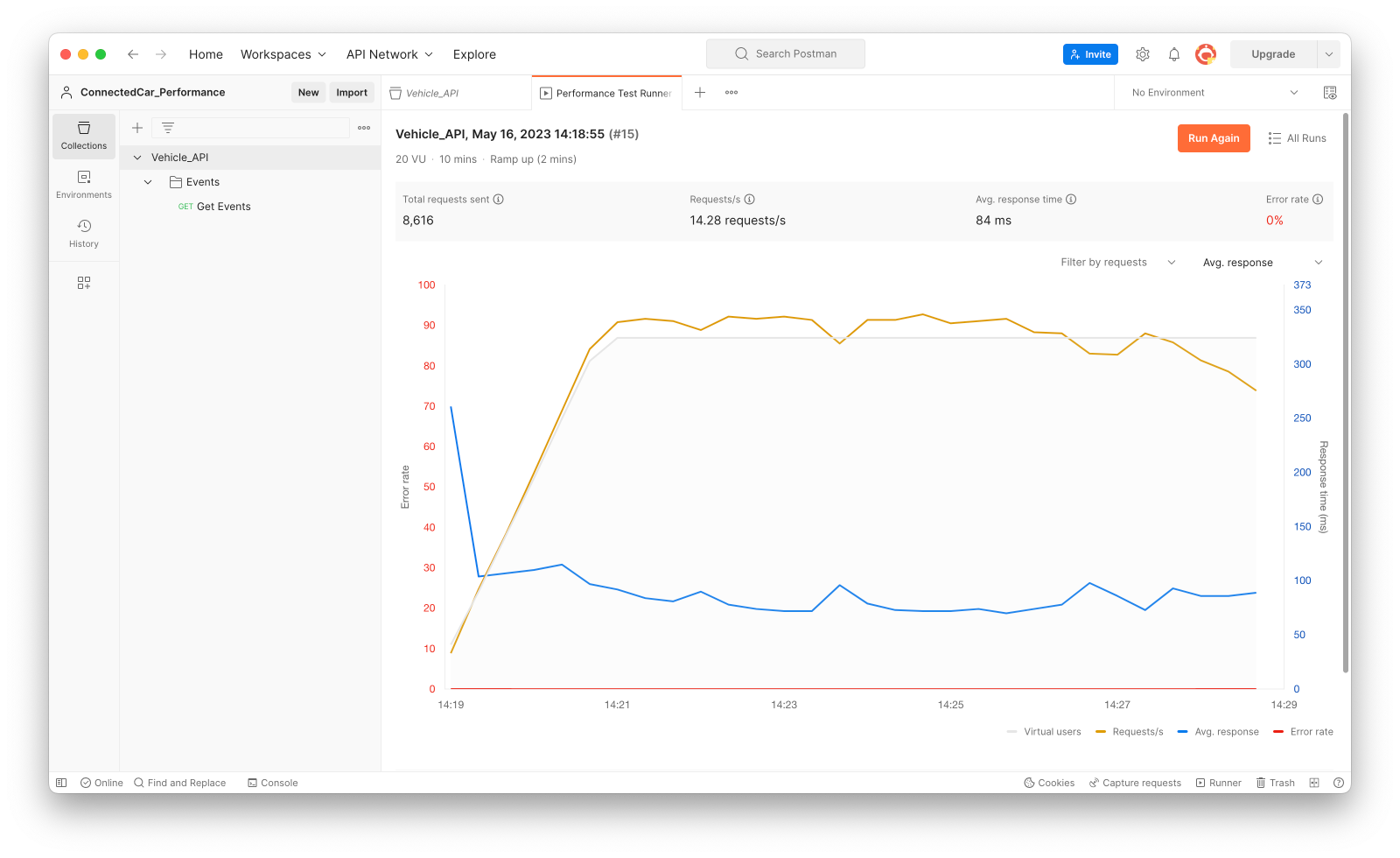 In a nutshell, we’re starting with a (made up) number of registered vehicles for the customers, then plugging in a number for what percentage are active at any given moment. When applied, this percentage yields the number of total active vehicles. We’re then plugging in another (made up) number for how frequently the vehicle head units query the “Get Events” endpoint, to arrive at a total number of requests per hour. From that number we arrive at the requests per second value, which is easier to track in the Postman Canary load testing tool.