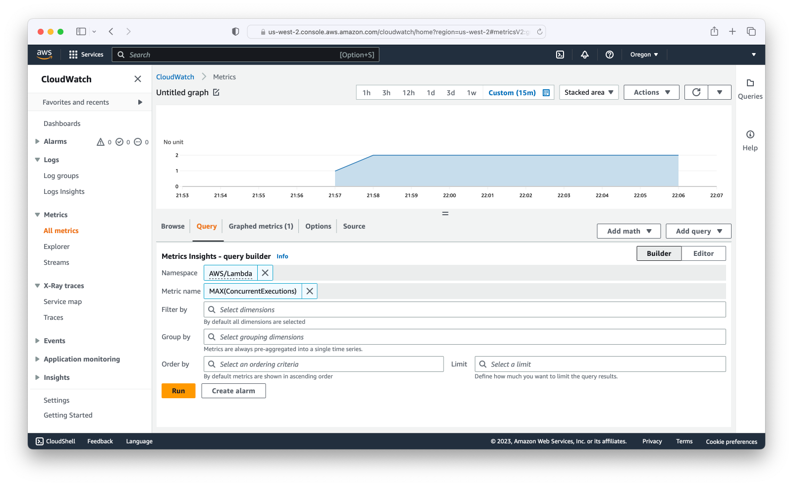 Switch back to the console and re-run the concurrent executions metric in CloudWatch. You should see the maximum value flatline at two, as shown below: