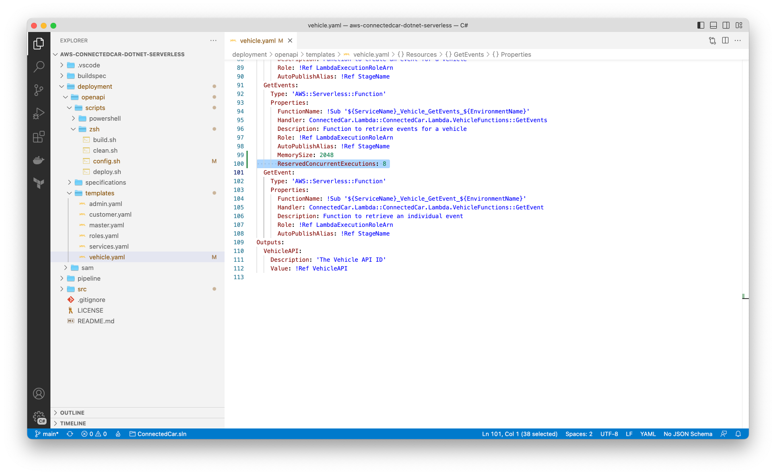 Open the vehicle.yaml template in VS Code and add the ReservedConcurrentExecutions property to the GetEvents Lambda resource, as shown below. For this test set the value for this property to two: